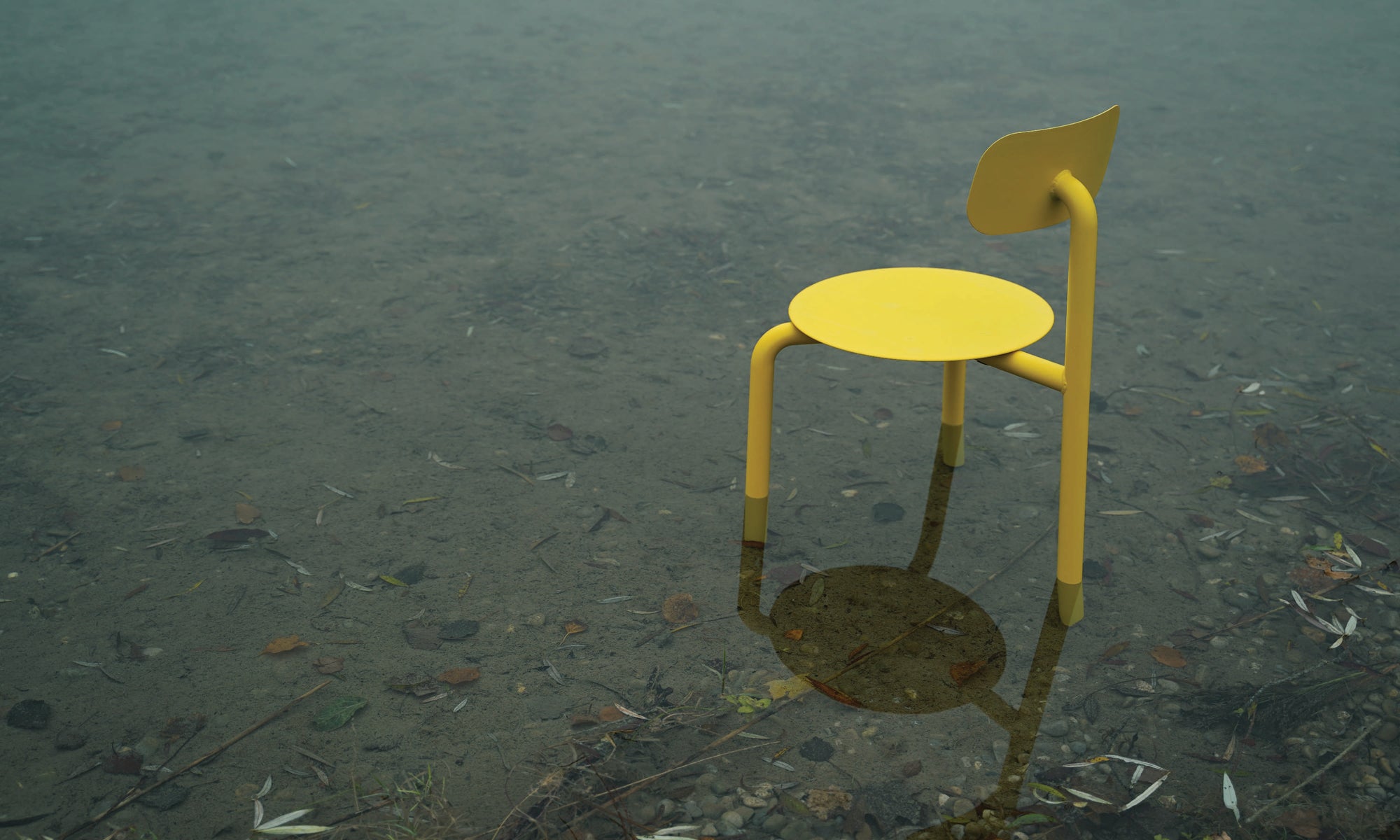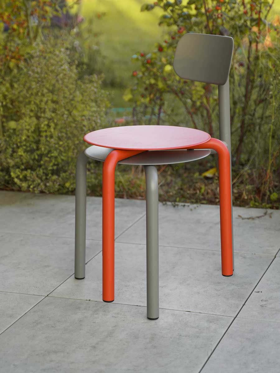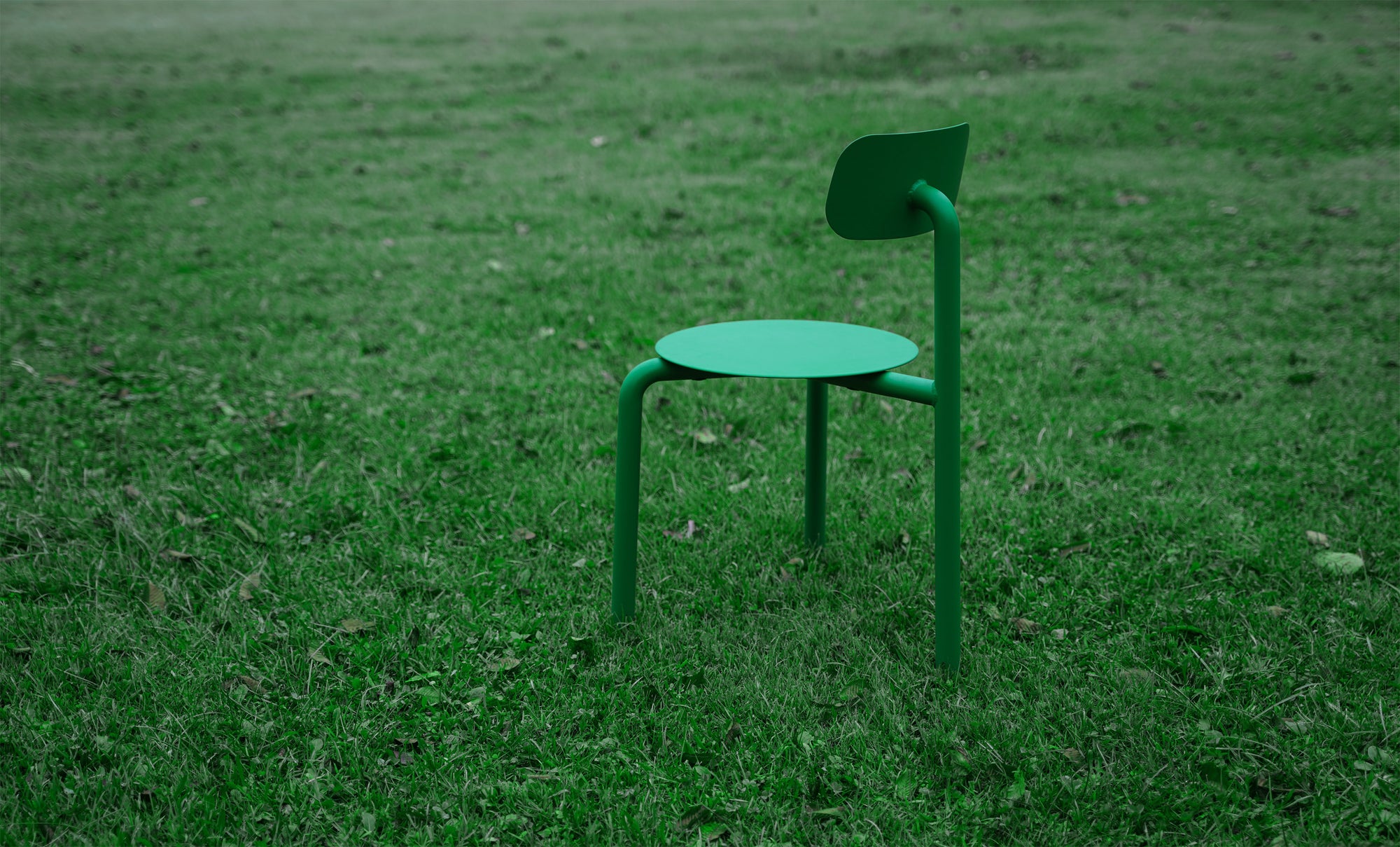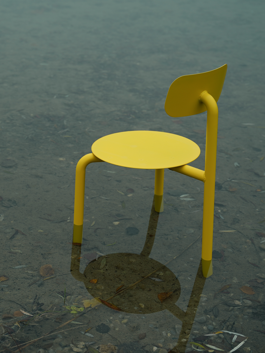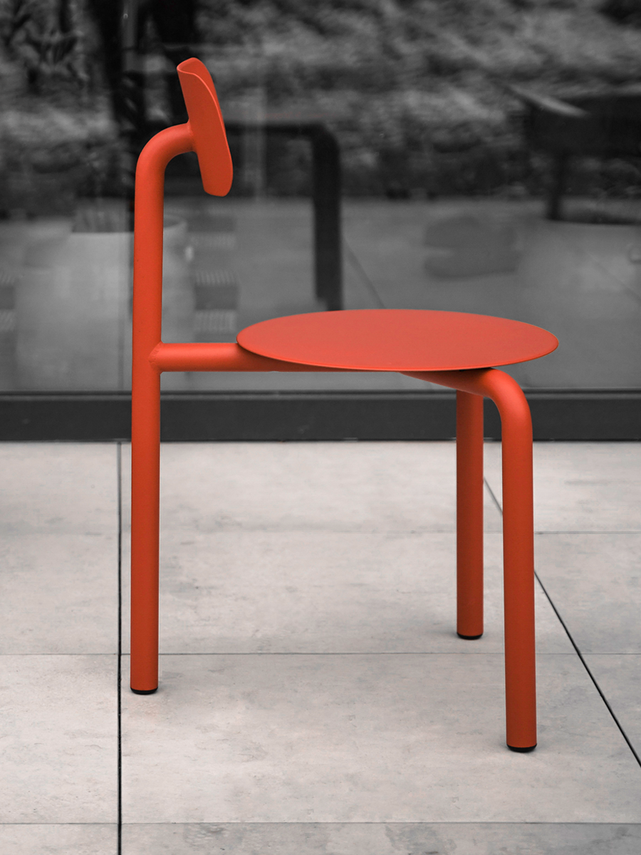Inspiriert von der Rahmenkonstruktion von Fahrrädern, bildet ein aufs minimum reduzierter Aluminiumrahmen seine federleichte und dennoch stabile Tragstruktur. Die sichtbaren und kunstvoll von Hand ausgeführten Schweißnähte betonen diesen Charakter. Sitz und Rückenlehne sind aus 4mm starken Aluminiumplatten gefräst, die Kanten sanft abgerundet. Wie der Name sagt, steht Drei auf drei Beinen und hat so auch auf unwegsamem Gelände immer festen Stand. Es können ca. 4 Stühle übereinander gestapelt werden. Passend zum Stuhl gibt es einen 3-beinigen Hocker/Beistelltisch, der ebenfalls gestapelt werden kann.
