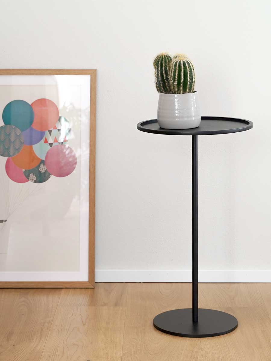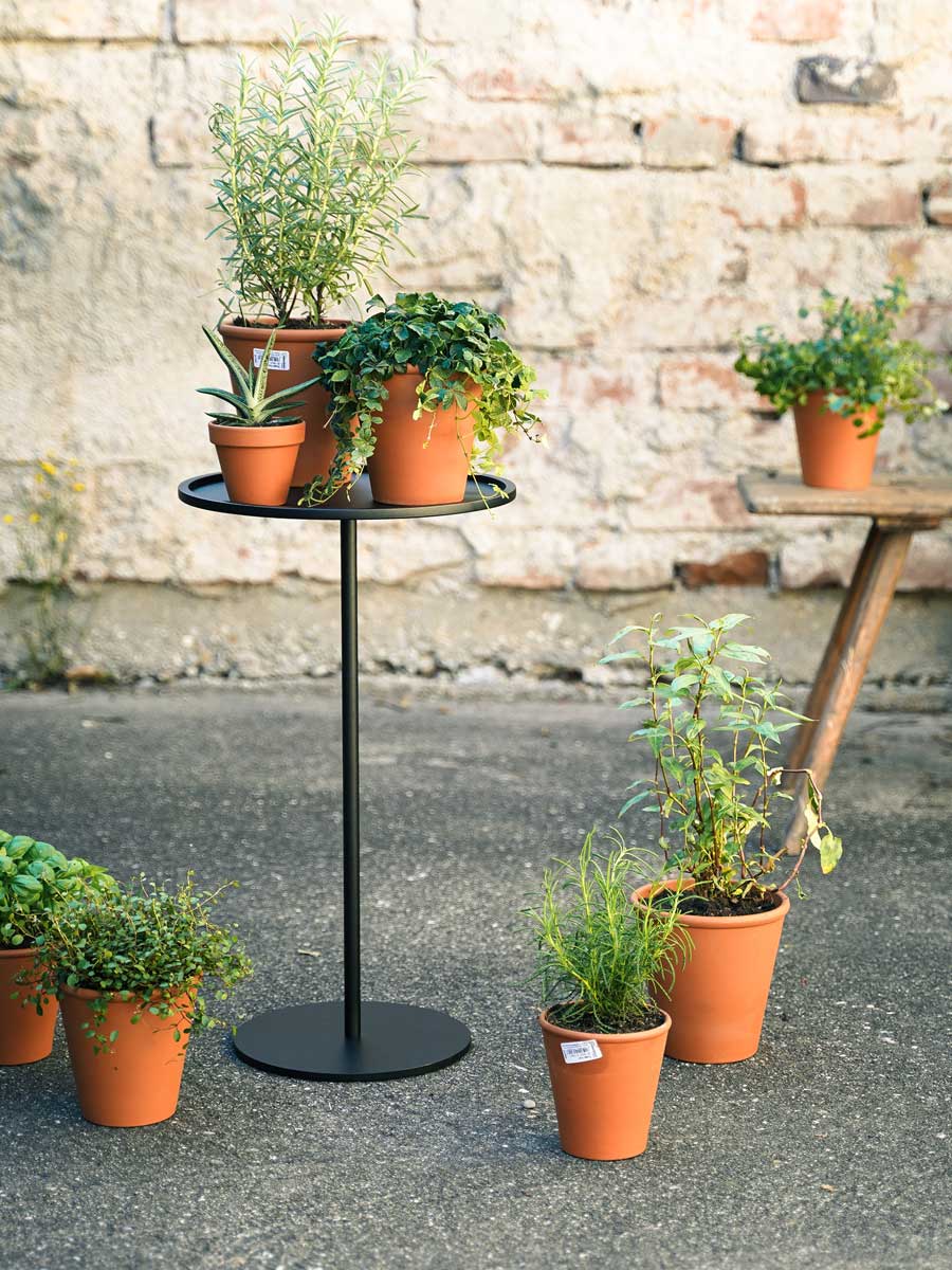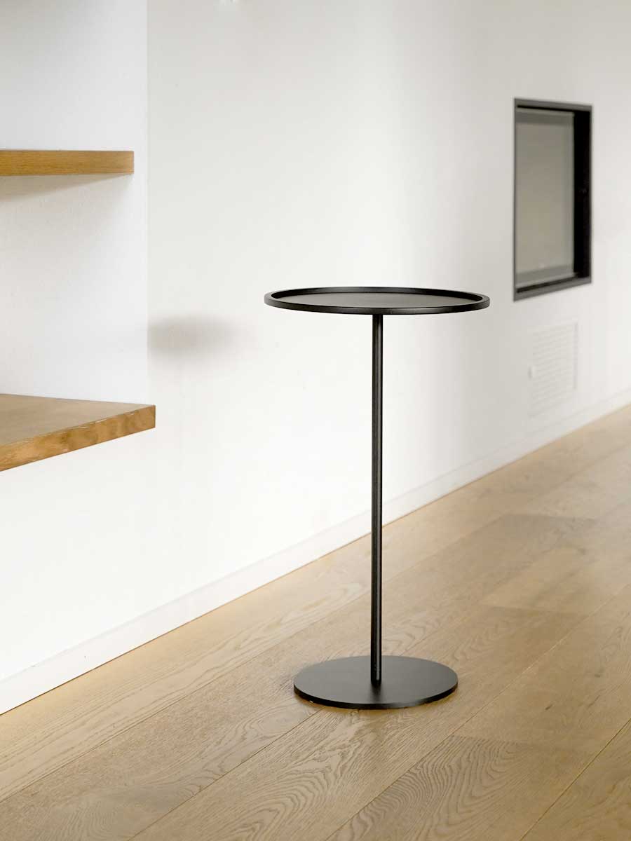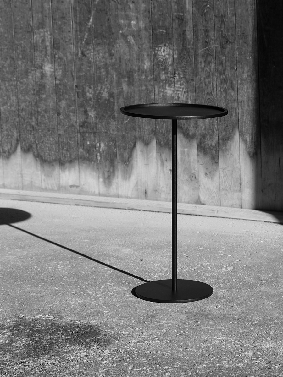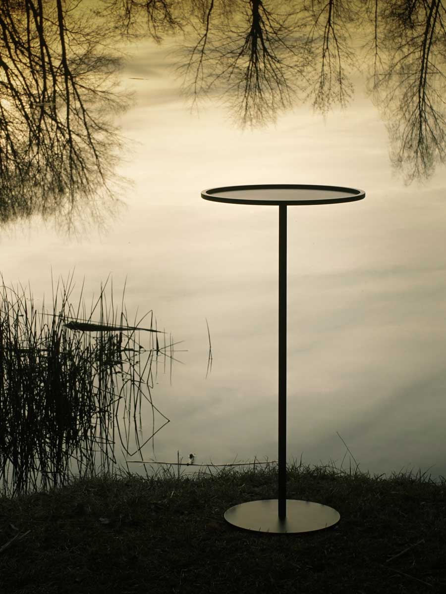 Die Runde Tische bestehen aus drei Teilen, Sockel, Stab und Platte, welche einfach zuammengedreht werden. Charakteristisch ist der 8mm breite Stahlrand, der aus einer flachen Stahlplatte herausgelasert und anschließend auf ein rundes Blech geschweißt wird. Der in der Mitte abfallende Rest wird anschließend zur Bodenplatte. Somit werden die Runden mit minimalem Verschnitt gefertigt. Das sind Details, die man zwar nicht sieht, aber schön zu wissen sind. Die Runden sind in drei Höhen erhältlich.